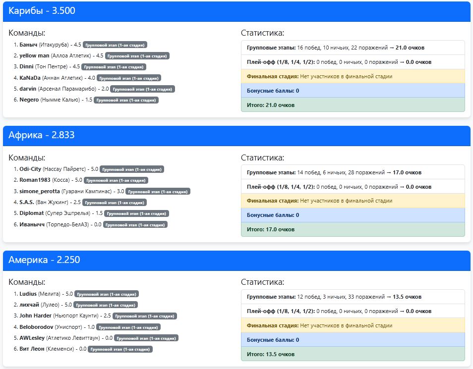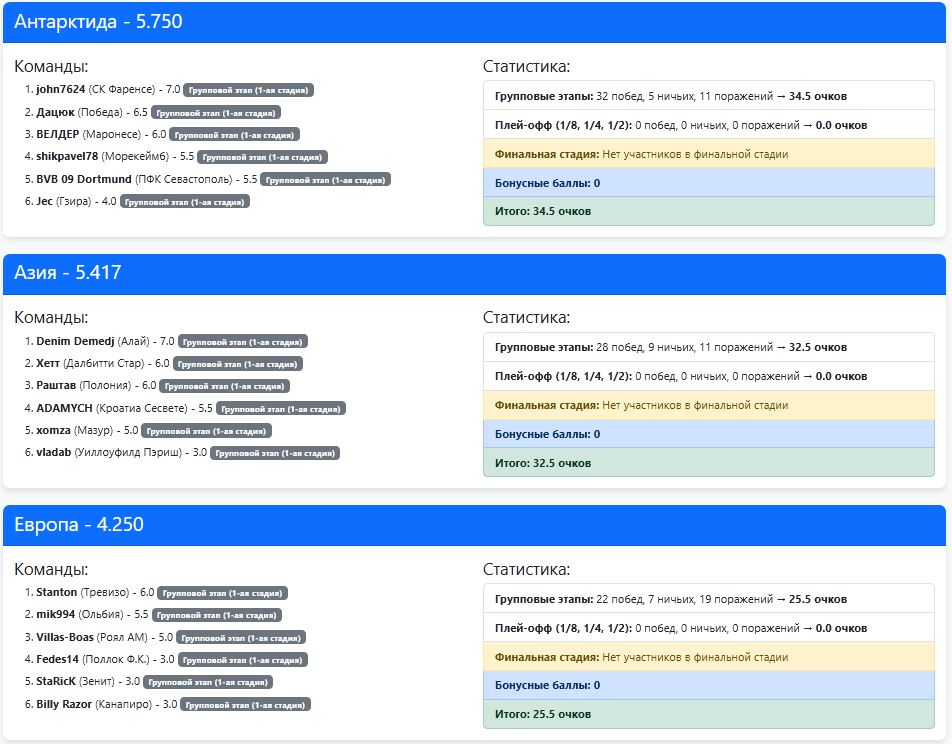 Битва континентов и личный зачёт менеджеров после первого группового этапа: показать