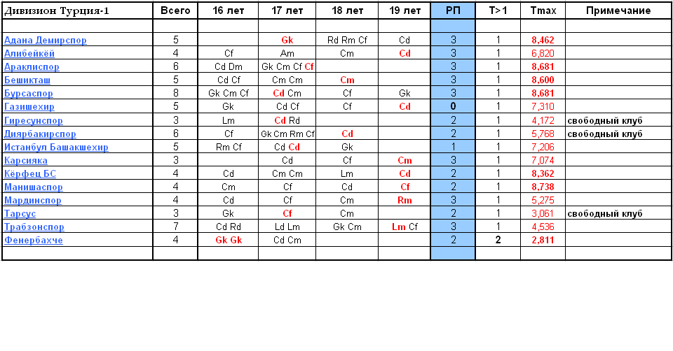В дивизионе три свободных клуба - Гиресун, Диярбакир и Тарсус. Произошёл набор юниоров в ДЮСШ, всего набран 21 игрок. Двое из них, оба в ДЮСШ Фенербахче, поставлены на тренировку Таланта, прицел на выпуск Т4. Параллельный кач только в ДЮСШ клуба Фенербахче. От набора воздержались два клуба, Адана Демирспор и Карсияка, игроки в ДЮСШ есть, 5 и 3 соответственно, разных возрастов. Пустых ДЮСШ нет. В ДЮСШ клуба Газишехир РП=0. В ДЮСШ дивизиона находятся 10 игроков 19 лет, семь из них на тренировке Таланта. Два игрока 19 лет в ДЮСШ клуба Трабзонспор, клуб заточен на выпуск Т8 и Т5 одного возраста. Клубам Адана Демирспор, Бурсаспор, может стоит игроков 19 лет перевести в основу как Т1. В ДЮСШ клуба Мардинспор игрок 19 лет не успеет достигнуть Т9, необходимо 132 тренировки, это больше чем в сезоне(126). Лучше выпустить как Т7. -------------------- |