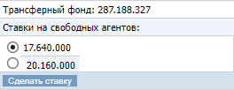 Смотрю и не могу понять, а зачем нужны эти "костыли" с %? не проще и эстетичнее ли поставить выбор ставки сразу рядом с указанием цен и добавить там "средняя ставка" или "медианная ставка"? либо вообще только цены оставить. Идея разумная. Возможно, сделаем сразу отображение ставки. и кстати непонятна надпись "Ставки на свободных агентов:", те кто на трансфере разве свободные агенты? Сумма ставок на свободных агентов уменьшает трансферный фонд команды. -------------------- |