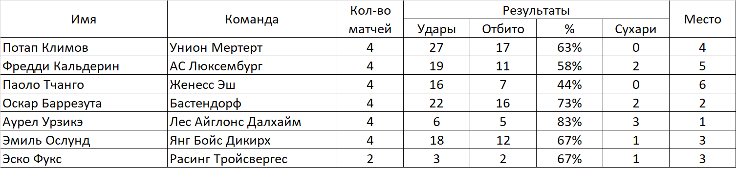 Будем вести статистику вратарей (только в матчах чемпионата). Для того, чтобы принять участие в конкурсе, необходимо оставить заявку. Определяться победитель будет по проценту отбитых мячей. Участник должен провести не менее 20 матчей за свой клуб в чемпионате. Правила подсчета: Процент отраженных ударов. К примеру : За сезон было нанесено в створ 123 удара. А пропустил ваш вратарь 23 мяча. Т.е отбил 100 мячей из 123 - х нанесенных. Таким образом 100 делим на 123 и умножаем на 100, получаем процент отраженных ударов равный - 81,3008. Победит тот, у кого он будет больше Заявку отправлять в следующем в виде: Сём Сильвестер Фугази-5(или имя фамилия клуб и обязательно ссылку на вратаря) В зачёт будут взяты 7-тур чемпионата, предварительные отчёты постараюсь делать каждые 5 туров. Итог будет подведён по достижению каждого участника 20-и матчей, в случае, если вратарь не сыграет нужное количество матчей по каким-либо причинам, он дисквалифицируется. 48-й сезон! Участники: 1.Потап Климов Унион Мертерт Завершил 2.Фредди Кальдерин АС Люксембург 3.Паоло Тчанго Женесс Эш 4.Оскар Баррезута Бастендорф 5.Аурел Урзикэ Лес Айглонс Далхайм 6.Эмиль Ослунд Янг Бойс Дикирх Завершил 7.Эско Фукс Расинг Тройсвергес 8.Эспиноза Маурисио Мериенда Свифт Эсперанж 9.Сесар Халл Келен 10.Саддам Хуссейн Унион Мертерт Сообщение отредактировал ТОРВАЛЬД - 11.12.2025, 11:32 |