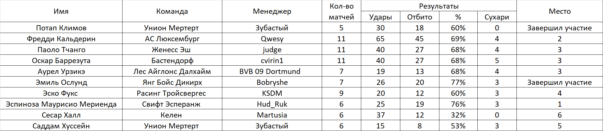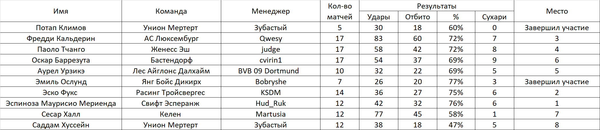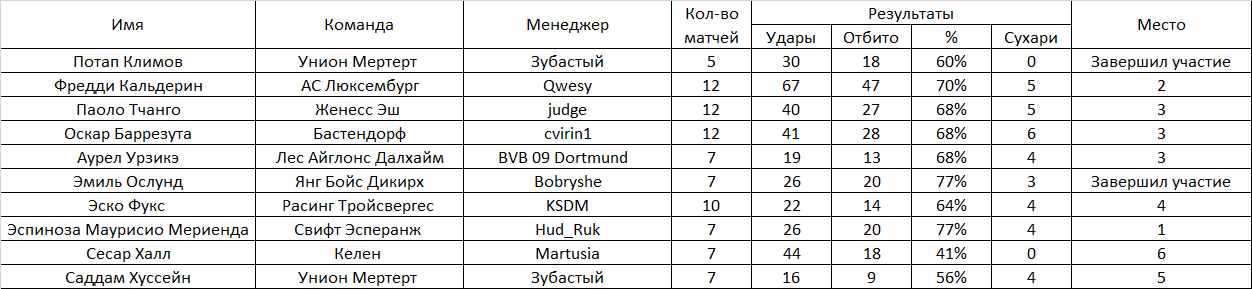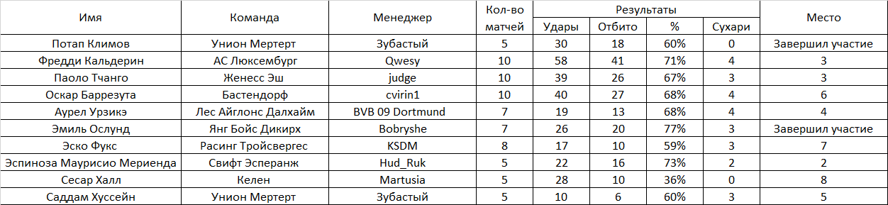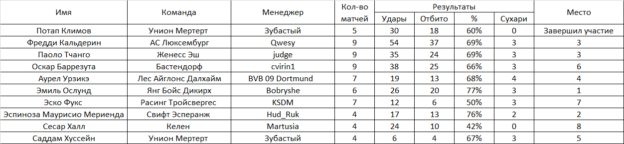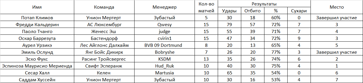 Будем вести статистику вратарей (только в матчах чемпионата). Для того, чтобы принять участие в конкурсе, необходимо оставить заявку. Определяться победитель будет по проценту отбитых мячей. Участник должен провести не менее 20 матчей за свой клуб в чемпионате. Правила подсчета: Процент отраженных ударов. К примеру : За сезон было нанесено в створ 123 удара. А пропустил ваш вратарь 23 мяча. Т.е отбил 100 мячей из 123 - х нанесенных. Таким образом 100 делим на 123 и умножаем на 100, получаем процент отраженных ударов равный - 81,3008. Победит тот, у кого он будет больше Заявку отправлять в следующем в виде: Сём Сильвестер Фугази-5(или имя фамилия клуб и обязательно ссылку на вратаря) В зачёт будут взяты 7-тур чемпионата, предварительные отчёты постараюсь делать каждые 5 туров. Итог будет подведён по достижению каждого участника 20-и матчей, в случае, если вратарь не сыграет нужное количество матчей по каким-либо причинам, он дисквалифицируется. 48-й сезон! Участники: 1.Потап Климов Унион Мертерт Завершил 2.Фредди Кальдерин АС Люксембург 3.Паоло Тчанго Женесс Эш 4.Оскар Баррезута Бастендорф 5.Аурел Урзикэ Лес Айглонс Далхайм 6.Эмиль Ослунд Янг Бойс Дикирх Завершил 7.Эско Фукс Расинг Тройсвергес 8.Эспиноза Маурисио Мериенда Свифт Эсперанж 9.Сесар Халл Келен 10.Саддам Хуссейн Унион Мертерт Сообщение отредактировал ТОРВАЛЬД - 11.12.2025, 11:32 |