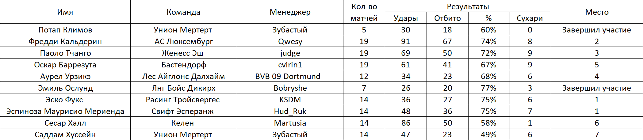 Будем вести статистику вратарей (только в матчах чемпионата). Для того, чтобы принять участие в конкурсе, необходимо оставить заявку. Определяться победитель будет по проценту отбитых мячей. Участник должен провести не менее 20 матчей за свой клуб в чемпионате. Правила подсчета: Процент отраженных ударов. К примеру : За сезон было нанесено в створ 123 удара. А пропустил ваш вратарь 23 мяча. Т.е отбил 100 мячей из 123 - х нанесенных. Таким образом 100 делим на 123 и умножаем на 100, получаем процент отраженных ударов равный - 81,3008. Победит тот, у кого он будет больше Заявку отправлять в следующем в виде: Сём Сильвестер Фугази-5(или имя фамилия клуб и обязательно ссылку на вратаря) В зачёт будут взяты 7-тур чемпионата, предварительные отчёты постараюсь делать каждые 5 туров. Итог будет подведён по достижению каждого участника 20-и матчей, в случае, если вратарь не сыграет нужное количество матчей по каким-либо причинам, он дисквалифицируется. 48-й сезон! Участники: 1.Потап Климов Унион Мертерт Завершил 2.Фредди Кальдерин АС Люксембург 3.Паоло Тчанго Женесс Эш 4.Оскар Баррезута Бастендорф 5.Аурел Урзикэ Лес Айглонс Далхайм 6.Эмиль Ослунд Янг Бойс Дикирх Завершил 7.Эско Фукс Расинг Тройсвергес 8.Эспиноза Маурисио Мериенда Свифт Эсперанж 9.Сесар Халл Келен 10.Саддам Хуссейн Унион Мертерт Сообщение отредактировал ТОРВАЛЬД - 11.12.2025, 11:32 |
