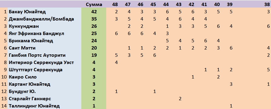 Было интересно собрать еще такую статистику Больше всего забито голов за сезон Бомбада 106 ( 41 сезон) Янг Эфриканз Банджул 106 (46 сезон) Меньше всего забито голов за сезон Старлайт Ганнерс 3 (42 сезон) Меньше всего пропущенных голов за сезон Уотермэн Ф.К. 7 ( 5 сезон) Больше всего пропущенных голов за сезон Старлайт Ганнерс 171 (42 сезон) Лучшая разница голов Янг Эфриканз Банджул +90 (46 сезон) Худшая разница голов Старлайт Ганнерс -168 (42 сезон) Наибольше набранных очков за сезон Бакау Юнайтед 87 ( 6 сезон) Команды не набравшие ни одного очка Нема Юнайтед ( 13 сезон) Таллиндинг ( 18 , 31, 32 ,43 сезон) Флэймминз Ф.К. (27 ,28 , 29 , 30 сезон) Бундунг Юнайтед ( 33 сезон) Янг Эфриканз Банджул (35 сезон) Старлайт Ганнерс ( 38 , 39 , 41 , 42, 44 сезон) Игрок забивший больше всех за сезон ( с 10 сезона) Кристиан Глоза (Джамбанджели Ф.К.) 55 (41 сезон) Лучший распасовщик за один сезон ( с 10 сезона) Эмануэль Бекер (Брикама Юнайтед) 25 (42 сезон) Гол + Пас (с 10 сезона) Кристиан Глоза (Джамбанджели Ф.К.) 63 (41 сезон) Таканори Нагаяма ( Бомбада ) 63 (47 сезон) Сообщение отредактировал Cherchell - 15.1.2026, 16:57 |