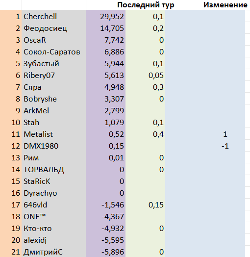 После 29-го тура. Ах, до чего же скучным выдался предпоследний тур. Результаты оказались абсолютно ожидаемыми, никаких сенсаций. В рейтинге всего одно изменение, да и то - в середине таблицы. Аж скулы сводит от такого тура. Впереди всего один шаг до финиша. Возможно, нас ждет что-то интересное. А пока комментировать-то и нечего.