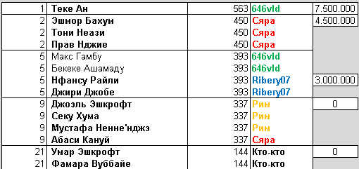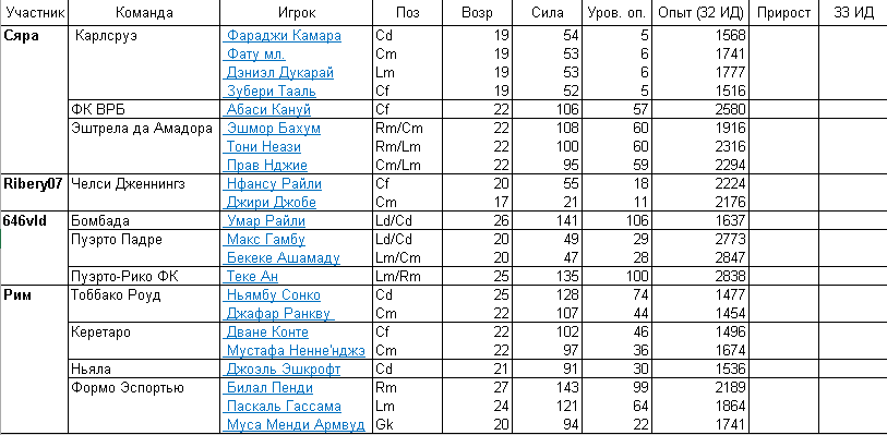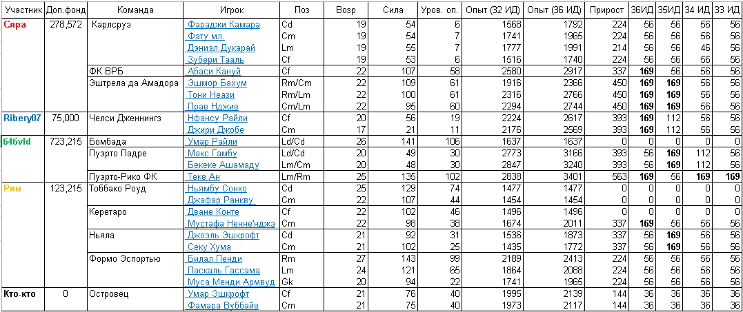 ![]() Игроки, не попавшие в список, входят в стартовый состав клубов, что исключено п. 2.3.4 1. Конкурс считается стартовавшим 2. Дозаявляться в участники можно до наступления середины конкурса (58 ИД), при этом опыт будет учтён с момента 33 ИД 3. Игроки, приобретающие статус Основного состава в клубе (ТОП-11), перестают участвовать в конкурсе 4. Игроки, выпадающие из Основного состава в клубе (ТОП-11), возобновляют участие в конкурсе с момента сообщения от Участника 5. Внесение дополнительно игроков по ходу проведения конкурса возможно по сообщению Участника -------------------- Тоббако Роуд (Банжул), Гамбия-1