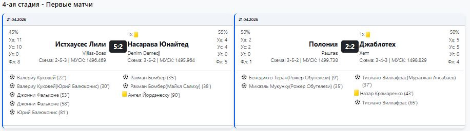 хотел пошутить, что у меня их 20, но как то ссыкотно шутки шутить с потусторонними силами, лучше уже состав не отправить) Завтра будет обзор, там всё и расскажу. Говорил же, без (ТП) и всё будет.... Добавлено 21st April 2026 - 21:36 Теперь всё понятно: откроет сникерс - порежет палец - и не отправит состав. Я уже и сам забыл Ванга это или Нострадамус, все врут, но сникерс купи... Нострадамус, Ванга... это в прошлом. Тут Мишаня, Адамыч есть, живой и ходящий ровно П.С. Не буду скромничать и ножкой елозить. Типа так. Финал, "Истхаусес Лили" (Истхаусес) - "Джаблотех" (Сан Хуан) Прости Николай, но такова селяви... Если не так, клаву спалю... Поясню. У "Насаравиков" уже зубы сточились, и так цеплялись на тонкого и теперь, три отыграть пусть и дома, ну за гранью возможного. Белов, имел шанс в родных стенах. Не воспользовался. Не уверен в проходе в финал, но думаю, что бронза ему светит. И в заключении от Адамыча. Мишаня своё возьмёт. "Лилям" и так канало долго. Фарт наверняка закончится. Серебро в "Мастерах", для нового лица, это БРЕНД!!!! Сообщение отредактировал ADAMYCH - 21.4.2026, 22:53 -------------------- СОТРУДНИК КОО. ЕВРОПА. Президент ФС ТУРЦИИ |