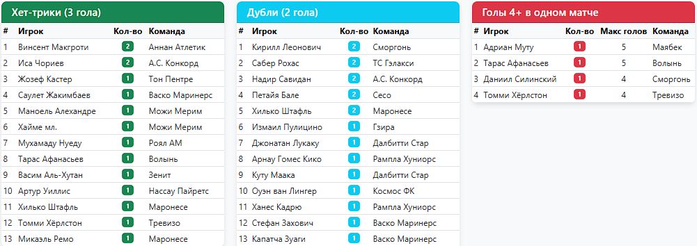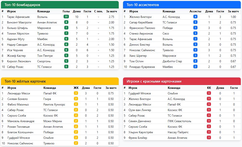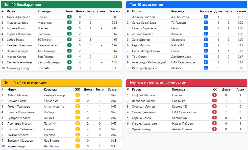 4 тур (17 марта), Далбитти Стар - Маябек - ПА (матч перенесён автоматически) 5 тур (19 марта), Маябек - Севастополь - ПО (матч перенесён организатором) 6 тур (24 марта), Севастополь - Маябек - 2:0 (https://www.butsa.ru/xml/tour/match.php?id=13623147) 8 тур (31 марта), Маябек - Рампла Хуниорс - 1:2 (https://www.butsa.ru/reports/13612851) 11 тур (9 апреля), Далбитти Стар - Маябек - перенос 4 тура 12 тур (16 апреля), Маябек - Севастополь - перенос 5 тура - - - - - - - 21 апреля - старт второго группового этапа!!! Сообщение отредактировал Баныч - 11.4.2026, 0:23 -------------------- Баныч / Грибаныч ("танцует" КТ МККЛ) / Карибаныч (президент Карибской Лиги) - тренер сборной ОАЭ и Реал Эспанья ![]() |