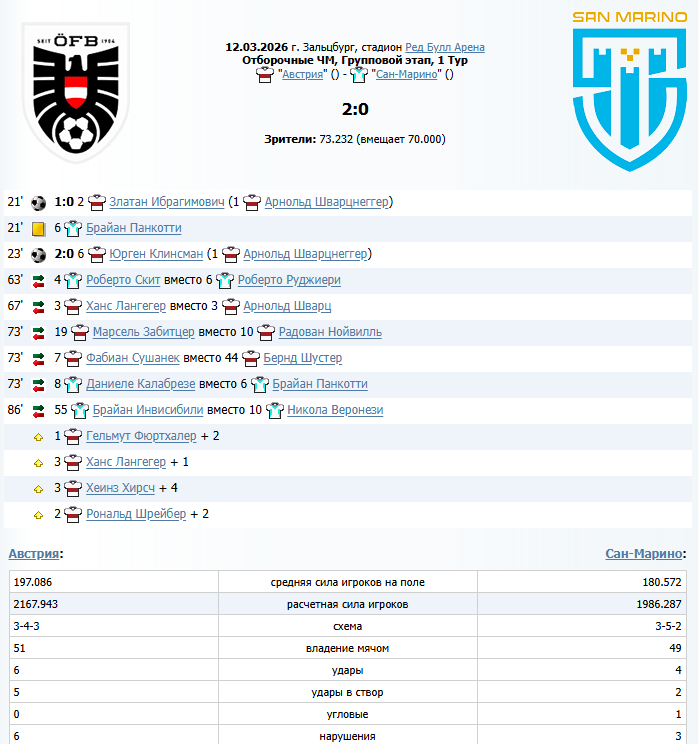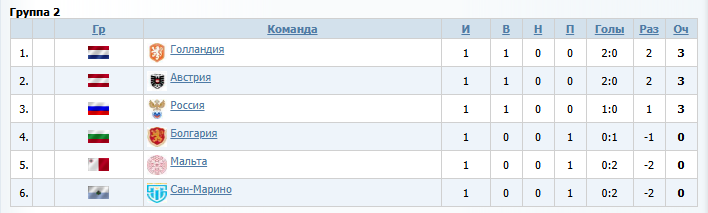 Расписание на отборочные будет следующим : Австрия (649.205) 12.03 Сан-Марино (дома) (284.476) 2:0 18.03 Россия (в гостях) (860.793) 19.03 Болгария (дома) (221.311) 02.04 Мальта (дома) (445.995) 23.04 Голландия (в гостях) (377.325) 30.04 Сан-Марино (в гостях) 06.05 Россия (дома) 07.05 Болгария (в гостях) 21.05 Мальта (в гостях) 28.05 Голландия (дома) Сообщение отредактировал А.В. - 12.3.2026, 23:00 -------------------- |