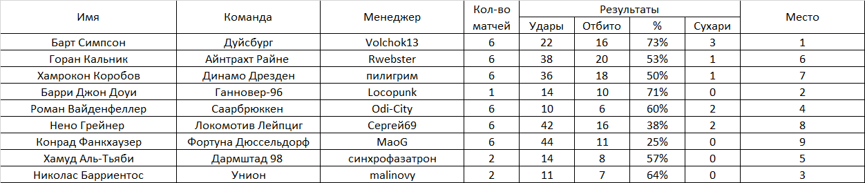 Будем вести статистику вратарей (только в матчах чемпионата). Для того, чтобы принять участие в конкурсе, необходимо оставить заявку. Определяться победитель будет по проценту отбитых мячей. Участник должен провести не менее 15 матчей за свой клуб в чемпионате. Правила подсчета: Процент отраженных ударов. К примеру : За сезон было нанесено в створ 123 удара. А пропустил ваш вратарь 23 мяча. Т.е отбил 100 мячей из 123 - х нанесенных. Таким образом 100 делим на 123 и умножаем на 100, получаем процент отраженных ударов равный - 81,3008. Победит тот, у кого он будет больше Заявку отправлять в следующем в виде: Акрадиуш Подставек Виктория Ашафенбург (или имя фамилия клуб и обязательно ссылку на вратаря) Предварительные отчёты постараюсь делать каждые 5 туров. Итог будет подведён по достижению каждого участника 15-и матчей, в случае, если вратарь не сыграет нужное количество матчей по каким-либо причинам, он дисквалифицируется. Начало конкурса с 8 тура чемпионата страны Призовой фонд конкурса - 15 000 000 гольденов. 1 место: 7 000 000 гольденов. 2 место: 5 000 000 гольденов 3 место: 3 000 000 гольденов 49-й сезон! Участники: 1. Барт Симпсон - Дуйсбург 2. Горан Кальник - Айнтрахт Райне 3. Хамрокон Коробов - Динамо Дрезден 4. Барри Джон Доуи - Ганновер-96 5. Роман Вайденфеллер - Саарбрюккен 6. Нено Грейнер - Локомотив Лейпциг 7. Конрад Фанкхаузер - Фортуна Дюссельдорф 8. Хумуд Аль-Тьяби - Дармштадт-98 9. Николас Барриентос - Унион Сообщение отредактировал ТОРВАЛЬД - 4.4.2026, 18:06 |