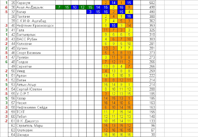 ![]() 1) Расчет очков ведется за последние 5 сезонов. 2) Самый большой прогресс у клубов Хазар и Алтын Асыр +21 и +19 (!!) позиций вверх. Оба клуба просто великолепно выступили во 2-м дивизионе. 3) Самое большое падение вниз у клубов: Копетдаг (-14) и Ахал Ак-Дашьяк -7 позиций. 4) Выше всех из представителей созданных позже остальных 3-х дивизионов забрался Энергостроитель Мары, уже 14-е(!!) место, молодцы! ![]() ![]() -------------------- |