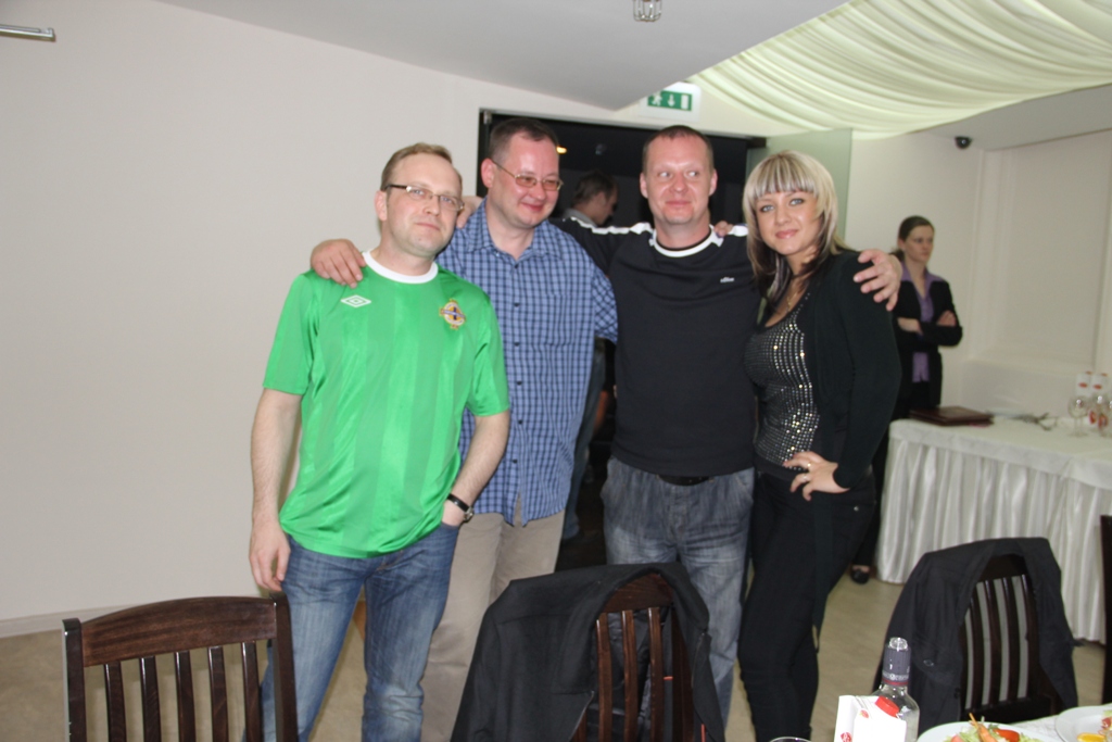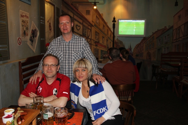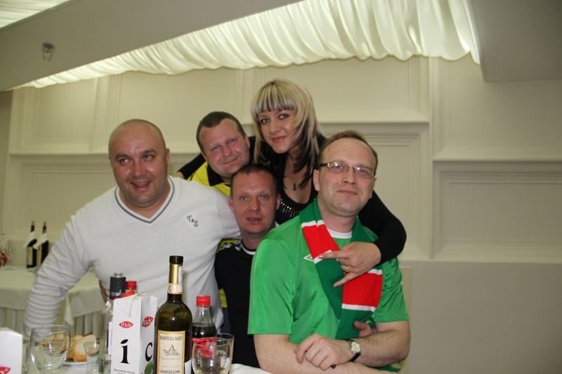 Слева направо: Дима (doomik), Валера (Forza DK - менеджер клуба Атлетико Хуила и поклонник Боруссии) нависает над al23, Юля и снова мужик в футболке сборной СИ и в шарфике Локо