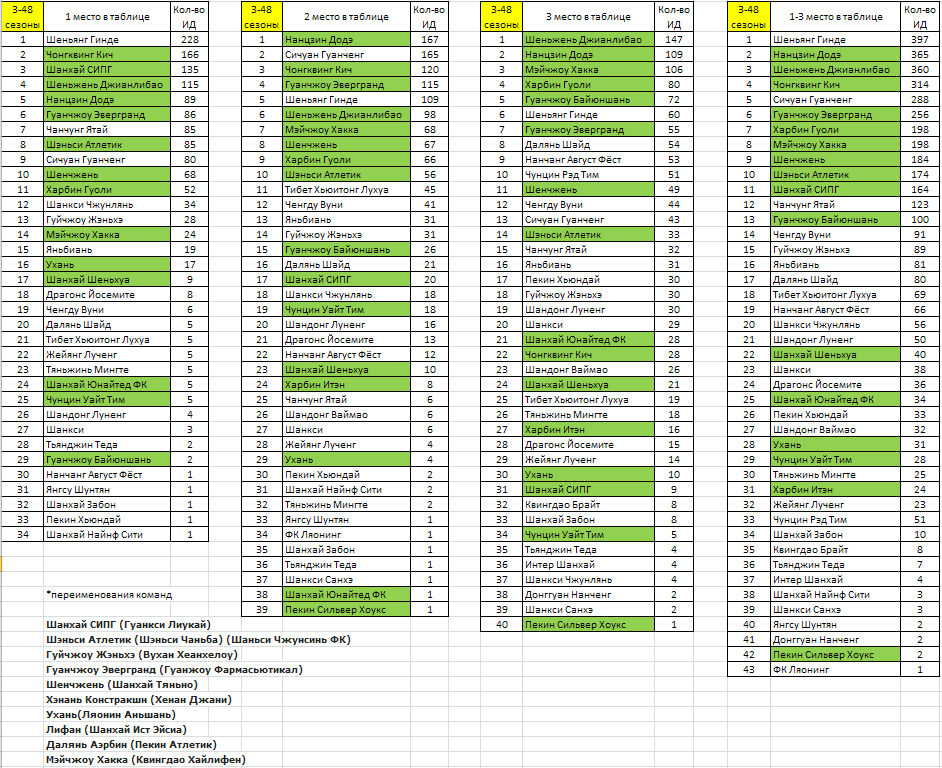 Всем доброго времени суток! Перелопатив каждый тур Чемпионата ФС Китая в Дивизионе-1, получились такие вот занимательные данные борьбы за призовые места. Добавлены данные за прошедшие сезоны. Так сказать посмотрим, кто есть кто на протяжении многих уже лет. Также, сравнивая данные по сезонам 3-44 и 3-48, виден прогресс по этому показателю.