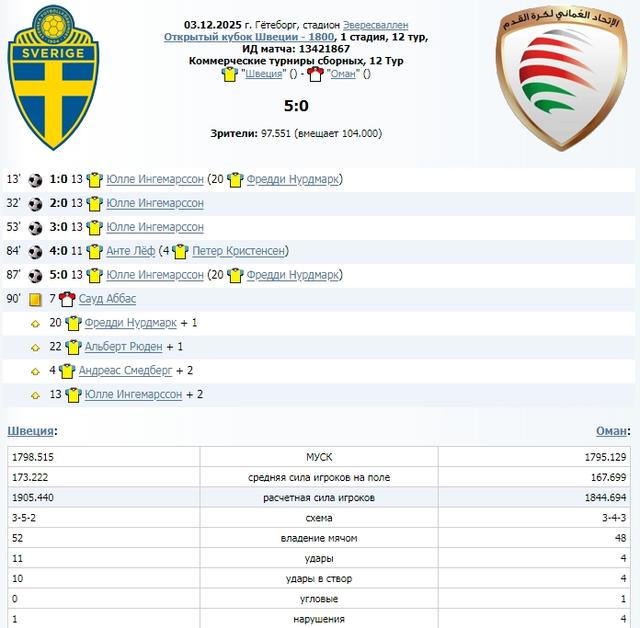 59' Гол 0:4 25 Никлас Берглунд (13 Юлле Ингемарссон)