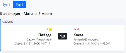 Поэтому ждём ещё от Победы официального оформления путёвки в плофф. И ждём также продолжения сказки для Кирилла. В двух оставшихся турах вполне по силам Победе продлить, если и не победную, то хоть и безпроигрышную свою серию. Календарь щадящий позволяет. Выезд к Мелите. А Тон Пентре в последнем туре, но уже домашний эксперимент (прилипнет дон Динни в Прилепе, или нет?).