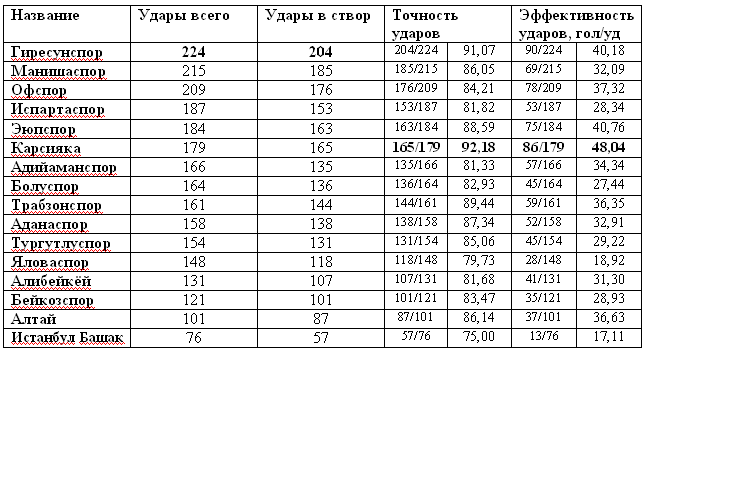 "Испартаспора", эффективность - 28,34% и 13-е место, это при том, что по общему количеству ударов