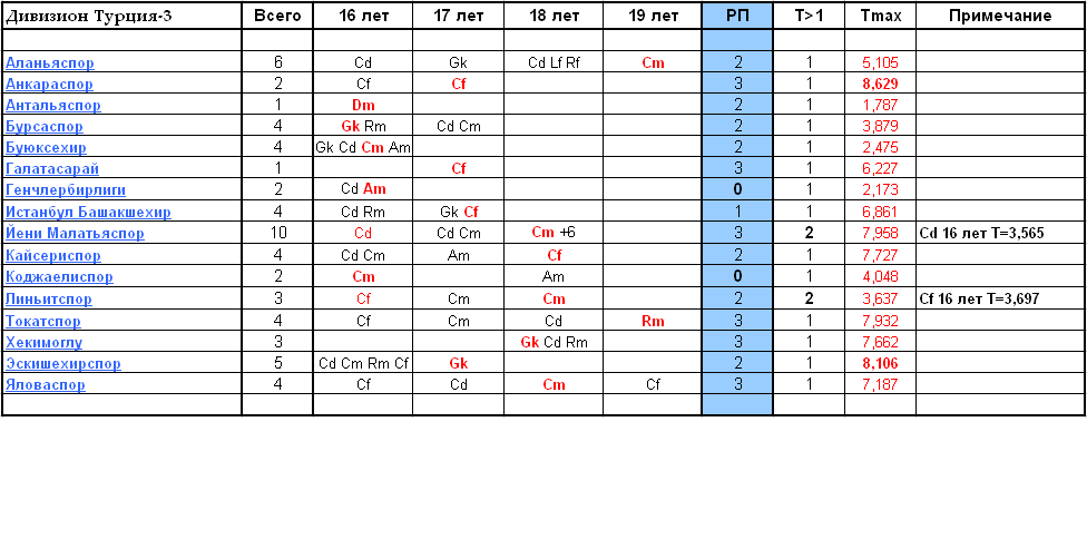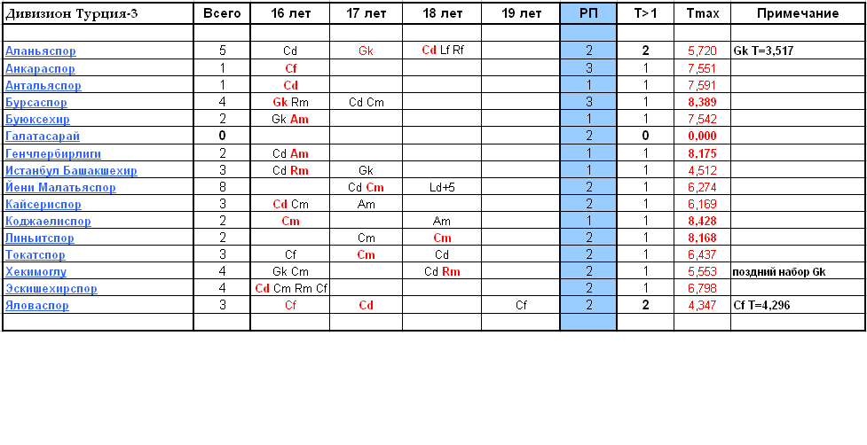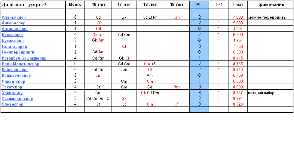 Йени Малатьяспор два игрока 18 лет не смогут выпуститься из ДЮСШ, не хватит РП. На сегодняшний день у клуба 2 РП, одно добавится в конце сезона и два добавятся в следующем сезоне. Итого в распоряжении будет 5 РП. Игроков 18 лет в ДЮСШ клуба шесть, на будующий сезон им будет по 19 лет. Также, в ДЮСШ клуба есть игрок 17 лет, который тренирует Талант, под него зарезервировано РП. Выходит на 6 игроков остается только 4 РП.