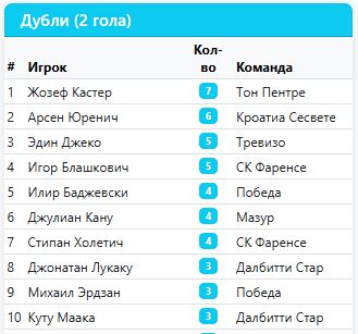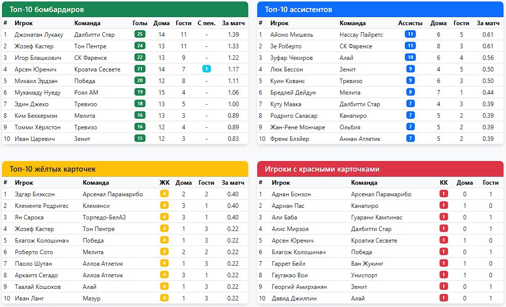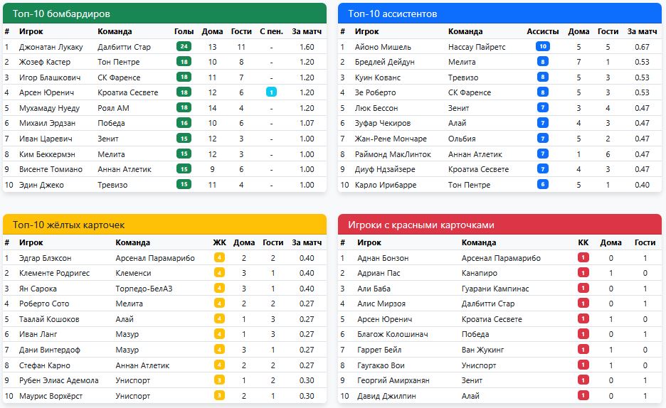 А для души (для себя любимых) в спаренных турах на экваторе (5-6 туры) очень успешно погоняли "оленей" (Мелита). Дважды уверенно по 3:0 (и на выезде, и дома потом). Жозеф Кастер записал на свой счёт 5 из 6 голов. И почти догнал в гонке бомбардиров самого Лукаку) 25 у Джонатана, и 24 теперь в активе Кастера. Правда и ложка дёгтя имеется в его бочонке с мёдом. Слишком часто празднует голы, снимая футболку. И не всем судьям такое по душе. И входит поэтому Жозеф и в анти топ-10, у которых по 4 жк имеется в активе.
