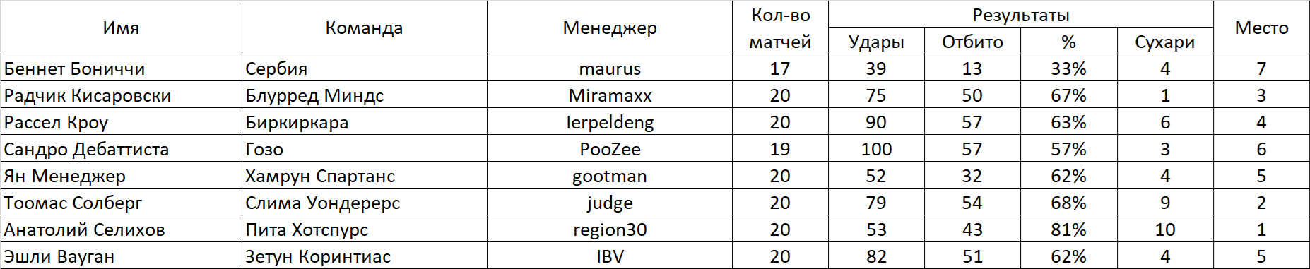 Итог будет подведён по достижению каждого участника 20-и матчей, в случае, если вратарь не сыграет нужное количество матчей по каким-либо причинам, он дисквалифицируется.