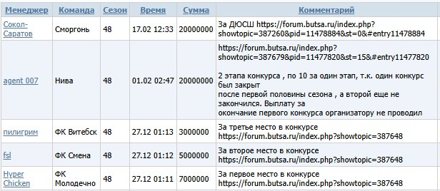 | i | Уведомление: Регламент - Участвовать в конкурсе может любой менеджер, имеющий команду в ФС Беларусь. - В зачёт идут победы в любом матче против команды не из ФС Беларусь. - Менеджер, выложивший в теме конкурса ссылку на свой победный матч, идущий в зачёт, автоматически становится участником. - Длительность второй части конкурса с 43-го по 84-й ИД (включительно). Начать участие в конкурсе можно в любой день данного периода сезона. - В случае победы над одной страной двух менеджеров, начисляются баллы менеджеру, который первый выложил данный результат. - Матч, сыгранный автосоставом с вашей стороны, в расчёт не идёт. - Если в матче КТ имеет место техническое поражение, в счёт конкурса идёт реальный результат матча. - Баллы участнику начисляются в случае, если страна соперника не была обыграна ранее. - Обыгранные страны в списке будут выделяться красным цветом. - За каждую победу начисляется 1 балл. - Если в конце конкурса, два участника набирают одинаковое количество очков, то побеждает участник, выложивший победный результат первым. Призовые: 1 место: 7 млн. гольденов 2 место: 5 млн. гольденов 3 место: 3 млн. гольденов |