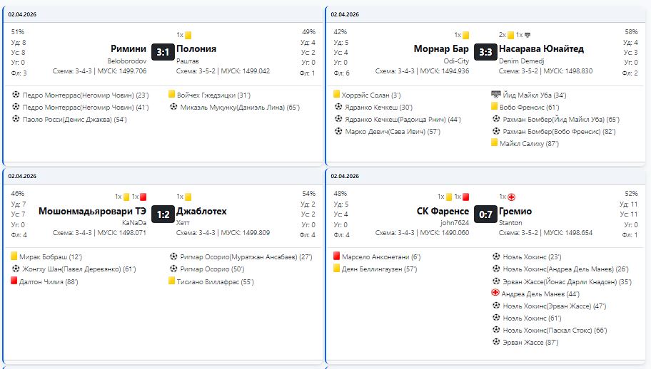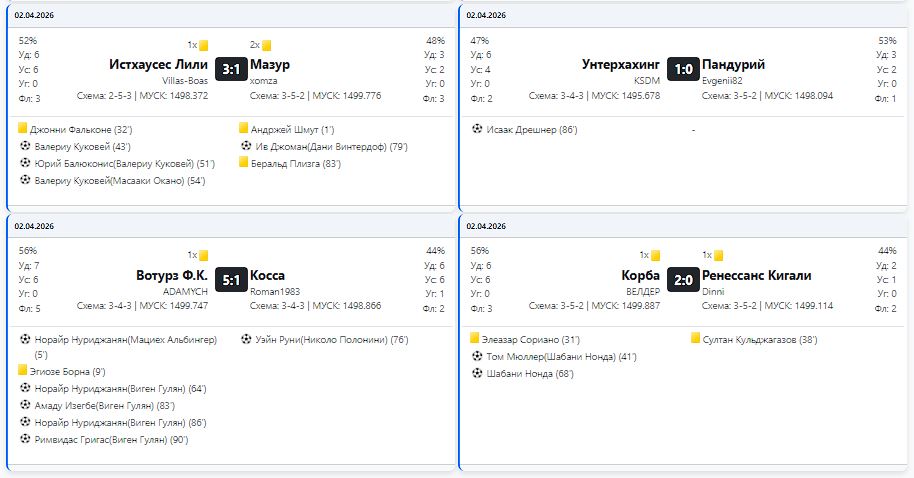 Не хотел я тебе обедню портить. Теперь я знаю, кто те лишенцы, что у Денимчиковой команды, весь Озверин спёрли под покровом ночи... Так мало того, сами не употребляли! Сцыканули, а фули! "Вотурз", команда из Бенина, где преклоняются шаманам! Так они пакостники, пока те спали перед матчем, насыпали им в питьё конячью дозу каждому, ещё и бубны с дудками, покрыли этим раствором! И теперь, прикиньте эту дикую смесь, ума лишённых шаманов и их инструментов, за воротами уважаемого мною Романа. Выскочил ошалевший от озверина, дух африканского Вуду и вот вам результат... Так что, я не при делах. Прости Рома ещё раз, знаю, что для тебя "Мастера", но такова селяви, как говорят французы, из бывшей её колонии, африканского Бенина. За саму игру, вещать не буду. Не сыплю, соль на сахар гостей. Разгром, он и в Африке тот. Короче, вот мой план, которым пользуюсь, сколько играю. Не затачиваю комы под КТ, а вот к тактике, на конкретный поединок, подхожу очень скурпулёзно. Меняю по сопернику, полю и всё остальное по плану. Не всегда работает, но процент успеха, достаточно велик. Не ожидал, если уже серьёзно, значит, всё правильно сделал. Оговорюсь сразу. Превышу МУСК, технарь в 3:0, и я дальше. Не занимаюсь такими вариантами. Выставил состав по правильному и по ФП. Во вторник, пусть будет всё, по справедливости! Жаль "Косу" пока. Затупилась. Скорее всего, недооценили. Я выполз из группы на тонкого и что с этим лузером бодаться? Скорее всего, такой был настрой соперника. Ждём, играем по честному! И пусть пройдёт... кто пройдёт.
