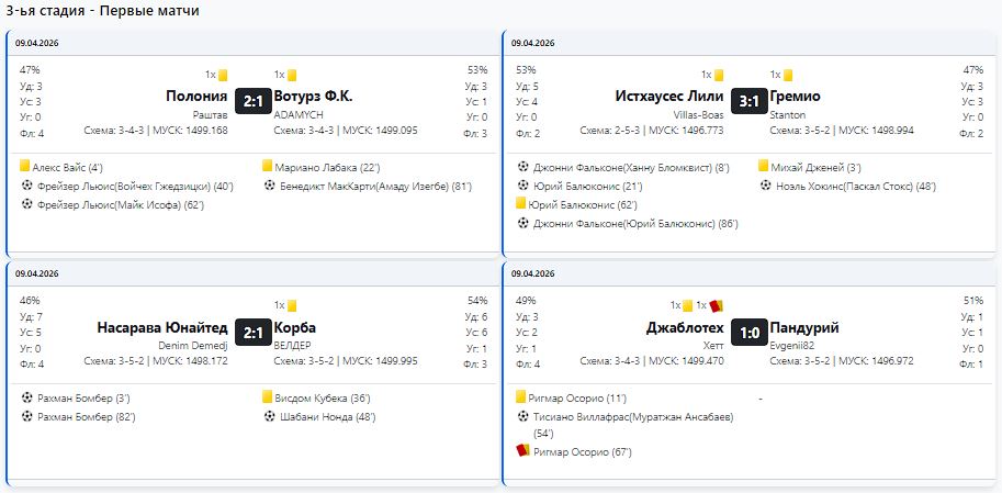Николя, я скромно не хотел говорить, что ты своё 1/4 финала, прокакал в первом поединке. Не каркаю и не собирался. Типа на фарт, хотя тут, Азии нет. Каждый сам за себя... Ничья, на родном стадионе, было слишком мягко, по отношению к оппоненту. А вот Виллас, тебя просто не простил и шаманы Бенина не помогли. 3:0, на пятьдесят четвёртой минуте и всё стало ясно. Не собирался в этом "разборе полётов", говорить про героев и анти героев. Всё просто. Есть два поединка, и победитель, проходит дальше. В данном случае, твой оппонент, тебя просто переиграл в два присеста. Хрен с ним, тем "Мастерсом" У нас дел в МККЛ, взяться и закончить. Сезон там отдохнули на бронзе, пора показывать, кто в хате МККЛ хозяин! Тем более, твои румыны там, рвут и мечут! МККЛ-приоритет!!!