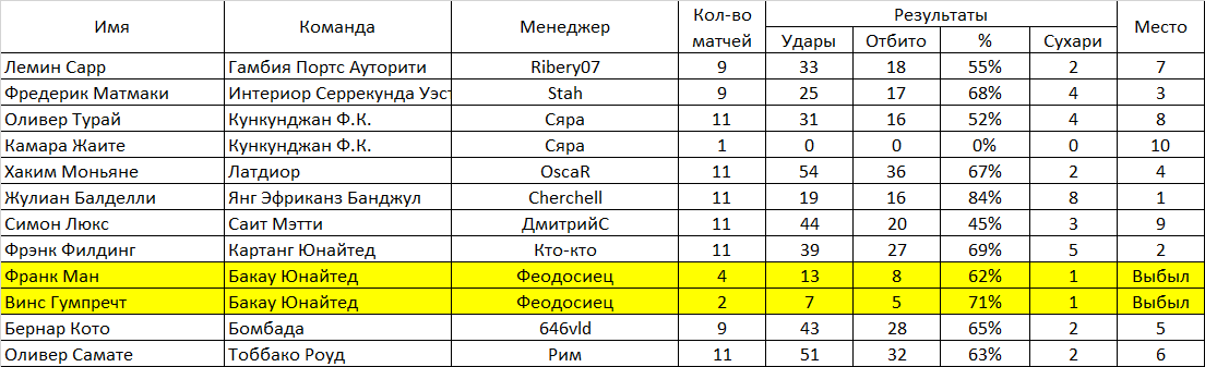 Итог будет подведён по достижению каждого участника 15-и матчей, в случае, если вратарь не сыграет нужное количество матчей по каким-либо причинам, он дисквалифицируется.